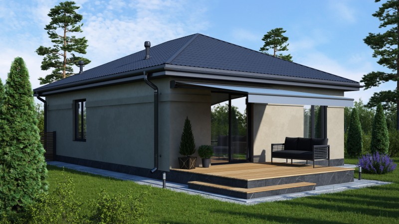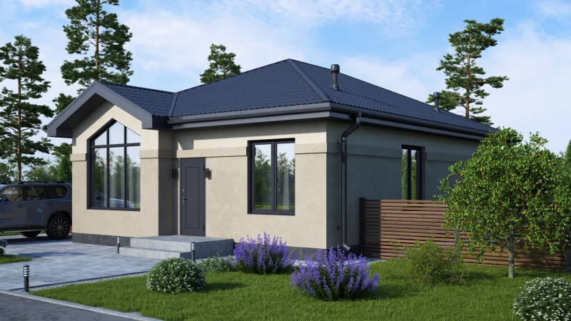 Компактный функциональный одноэтажный дом с оригинальным фасадом и интересной кровлей. Имеет три просторных спальни, кухню гостиную с выходом на задний двор, котельную-постирочную, второй санузел можно разместить в котельной.