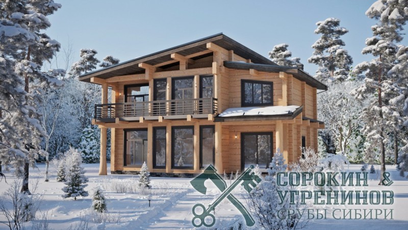 Индивидуальный проект дома из лафета с элементами каркасных столбов и балок Post&Beam, столбы и балки выполнены из бревна диаметром 460мм, стены из лафета 250х400мм. Общая площадь дома 256м2. Высота потолков 4 метра, большие витражные французские окна в пол в гостиной на первом этаже, пологая крыша односкатная, балкон на две стороны.